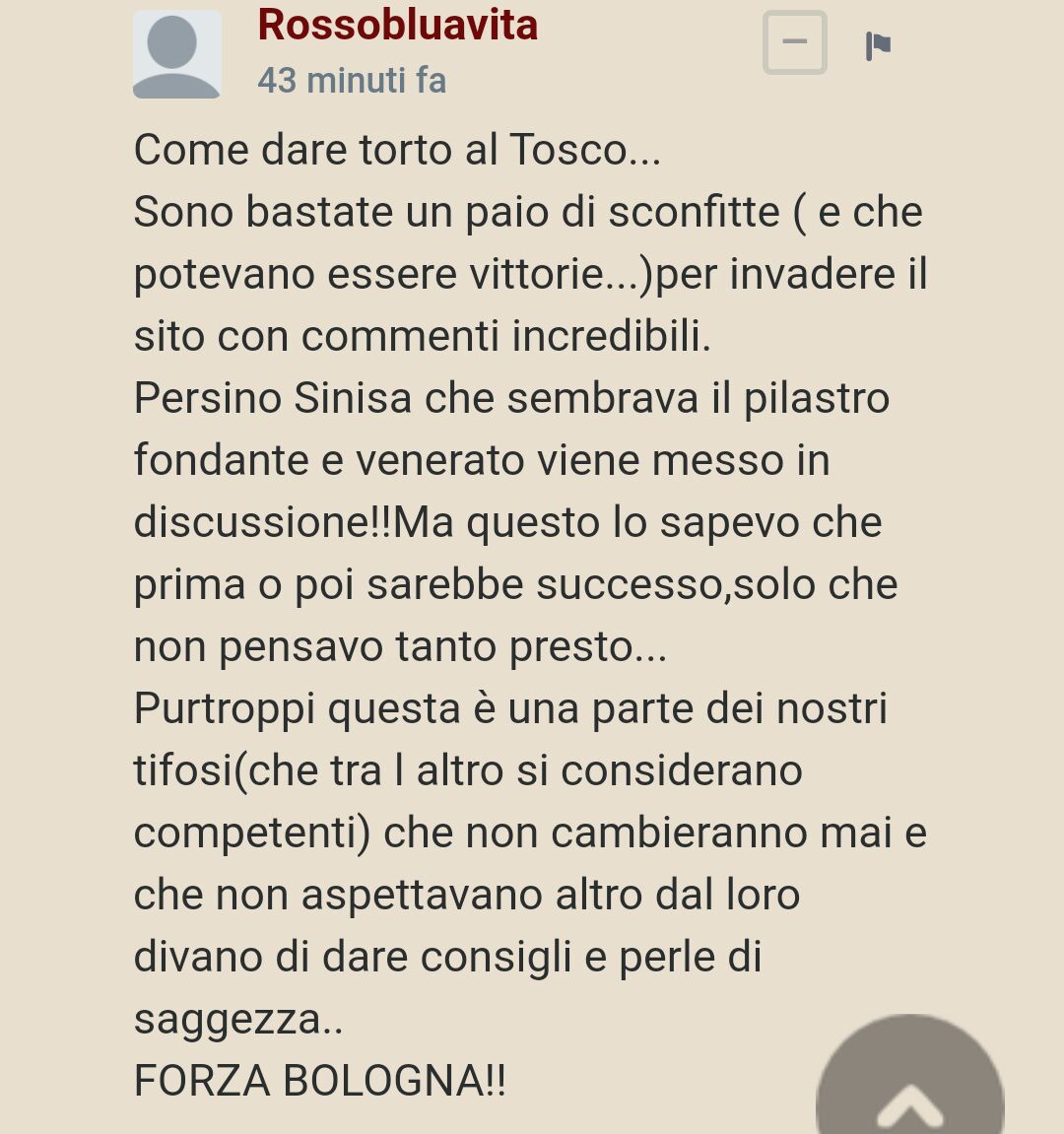 poi spero che Saputo venda a gennaio come si sente e che Sinisa sia sfrombolato via a giugno, tanto prima non lo esonereranno mai, a meno di non ritrovarci come con Inzaghi dopo lo 0-4 in casa dal Frosinone
