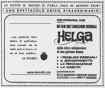 In Italia il primo film si intitolava Helga - Il concepimento, la fecondazione, la nascita, i problemi sessuali, ma era noto anche come Helga - Lo sviluppo della vita umana. Il sequel si intitolava invece Helga e Michael. C’è anche una terza pellicola della serie, Helga e gli uomini. Protagonista della trilogia è Ruth Gassmann, un’attrice molto avvenente che ha fatto anche un film con Jess Franco, ovvero il bizzarro L’isola dei piaceri proibiti.